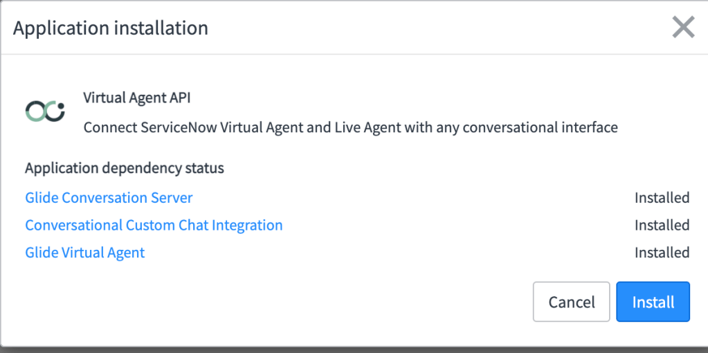- Find the Virtual Agent API application using the filter criteria and search bar.You can search for the application by its name or ID. If you cannot find the application, you may have to request it from the ServiceNow Store.Visit the ServiceNow Store website to view all the available apps and for information about submitting requests to the store. For cumulative release notes information for all released apps, see the ServiceNow Store version history release notes.