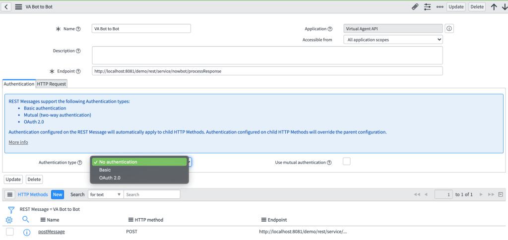 - Set up Basic or OAuth authentication. Ensure that Requires Authentication is selected on the Scripted REST Resource page for Bot Integration.