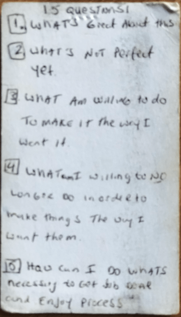 These five questions have been my motivation when I needed a kick in the butt, my inspiration when I was in need of a creative idea or flash of genius, and a reminder of the promises and commitments I made.