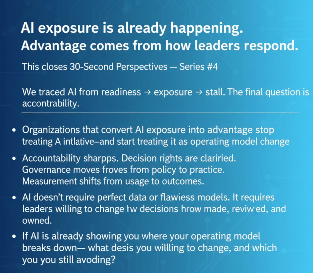 Organizations that convert AI exposure into advantage make a clear shift: they stop treating AI as a technology initiative and start treating it as an operating model change.